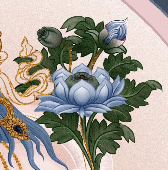 En dessous, Avalokiteshvara Bodhisattva est assis sous un arbre dans une posture de demi-lotus. Ses yeux contemplent avec amour une autre Sita Tara beaucoup plus petite, visible au niveau de son cœur. Des torrents d’eaux nées des larmes qu’il vient de verser jaillissent contre la formation semblable à un rocher sur lequel le bodhisattva est assis. Un sentiment d’urgence imprègne ce courant impétueux ; pourtant, au-dessus, Bodhisattva Avalokiteshvara et Sita Tara demeurent sereins. Indivisibles, intouchables, et apparemment en dehors du temps, ils semblent être installés en ce lieu que T.S. Eliot appelle « le point de quiétude du monde tournoyant ». Enveloppés dans l’air divin, en sécurité au-dessus de l’eau tourbillonnante, les deux compagnons délicieusement incarnés et remplis de compassion se regardent dans un paysage onirique venu d’un autre monde. Merveilleusement calmes… apaisés… accomplis. Dans un espace de clarté lumineuse, Avalokitehsvara et Sita Tara se rencontrent dans une danse infinie de pureté qui reste disponible à chaque instant ».