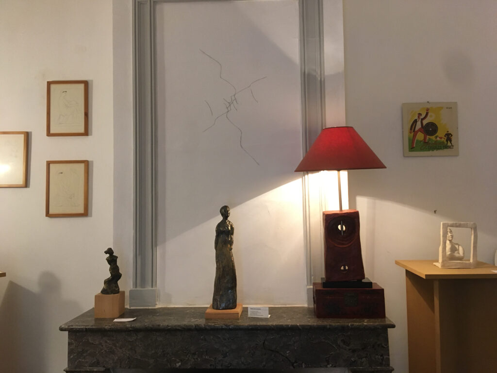 Passée la porte d’entrée où trônent un livre d’or et quelques cookies, la maison au sol carrelé noir et blanc impose d’emblée une forte personnalité. Dans le fond du couloir, on aperçoit un escalier monumental. Les plafonds sont hauts, ornés de moulures, toute une ambiance. Sur la gauche, une pièce appelle le visiteur. Là, posées sur des meubles recouverts de draps blancs, dans une lumière tamisée, les sculptures nous attendent. Un texte, très poétique, accompagne la plupart, venant compléter, élargir, amplifier, la résonance de l’œuvre. De magnifiques lampes, dont les pieds ont été réalisés par l’artiste, donnent au lieu dans son ensemble une atmosphère hors du temps. C’est à une sorte de voyage, presque une traversée, que nous invitent les réalisations rassemblées ici.